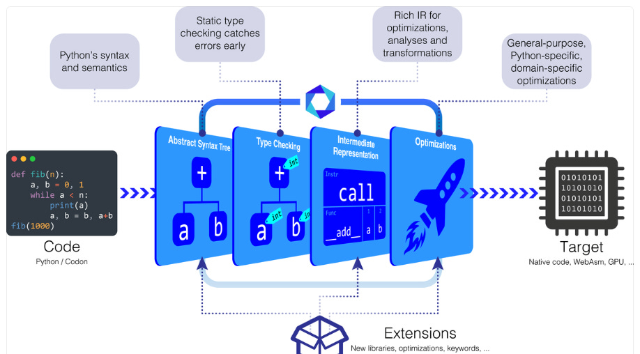 Boost Python performance with Codon, a compiler delivering 100x speedup, native multithreading, and machine code efficiency for compute-intensive tasks.