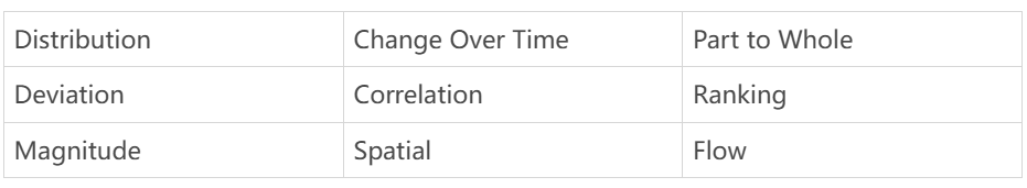 In these scenarios, you might want to see a data distribution, its trends over time, or the relationship between parts and the whole.
