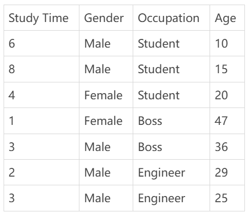 Let me give an example with the following training data. You can see that people with different occupations have different ages and study times.
